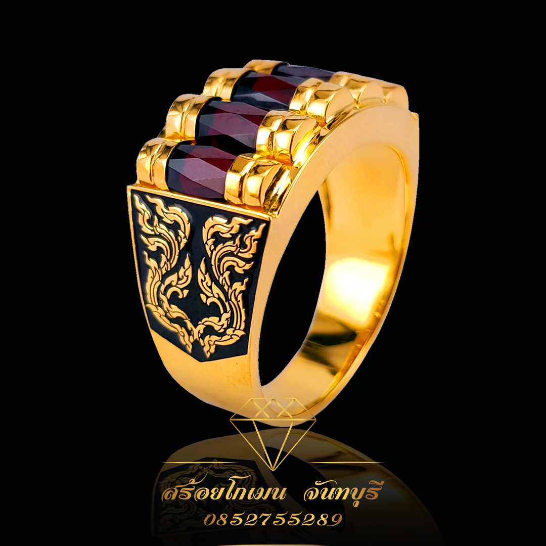 แหวนโกเมน5เม็ด แกะสลักลายไทย